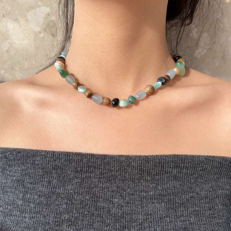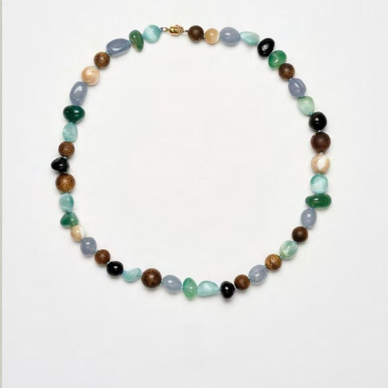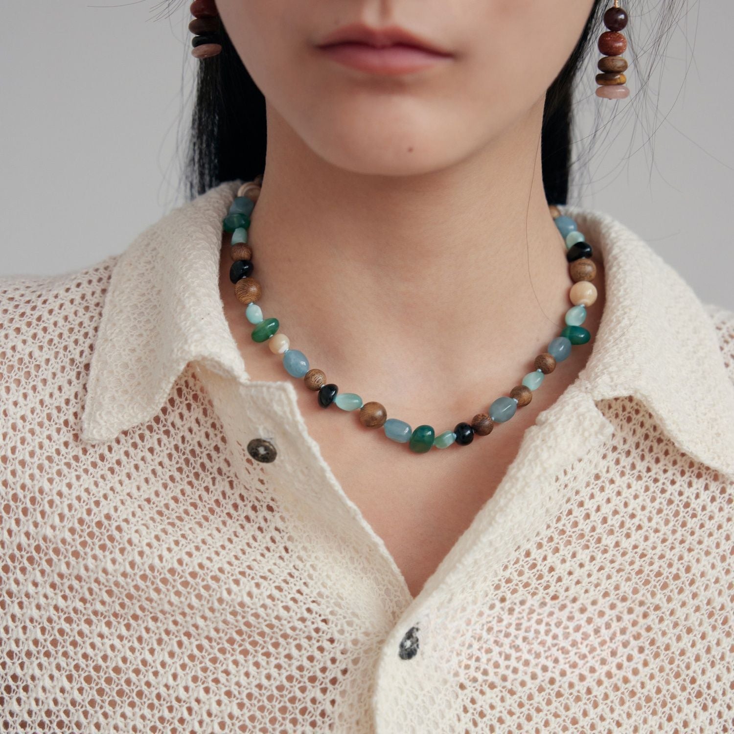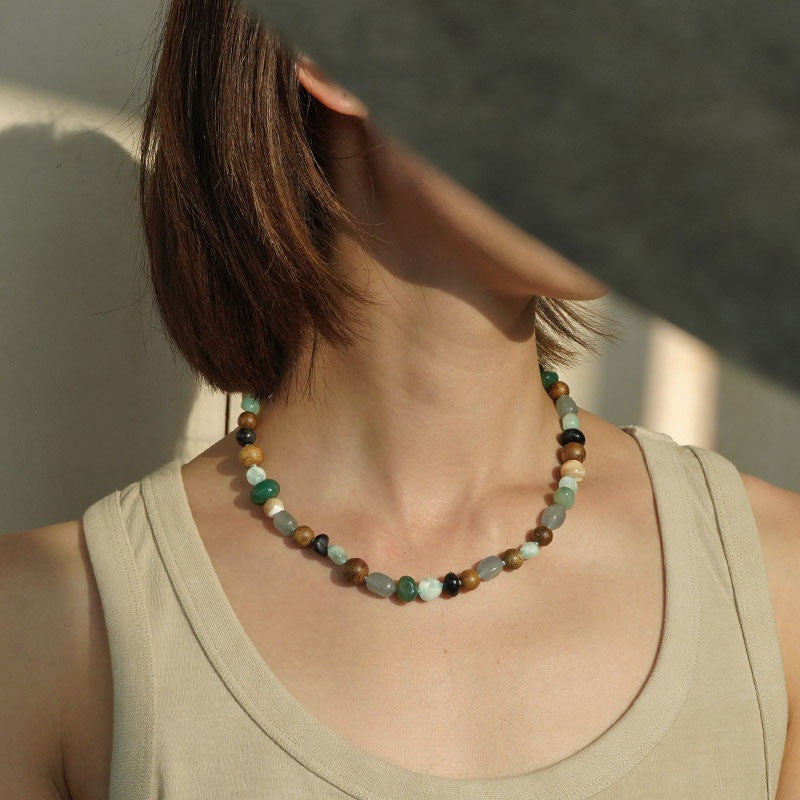 Handmade necklace featuring natural stone and agar-wood beads with real gold plating for color retention. A unique accessory that blends organic textures with minimalist geometry. Ideal for layered looks or statement styling.